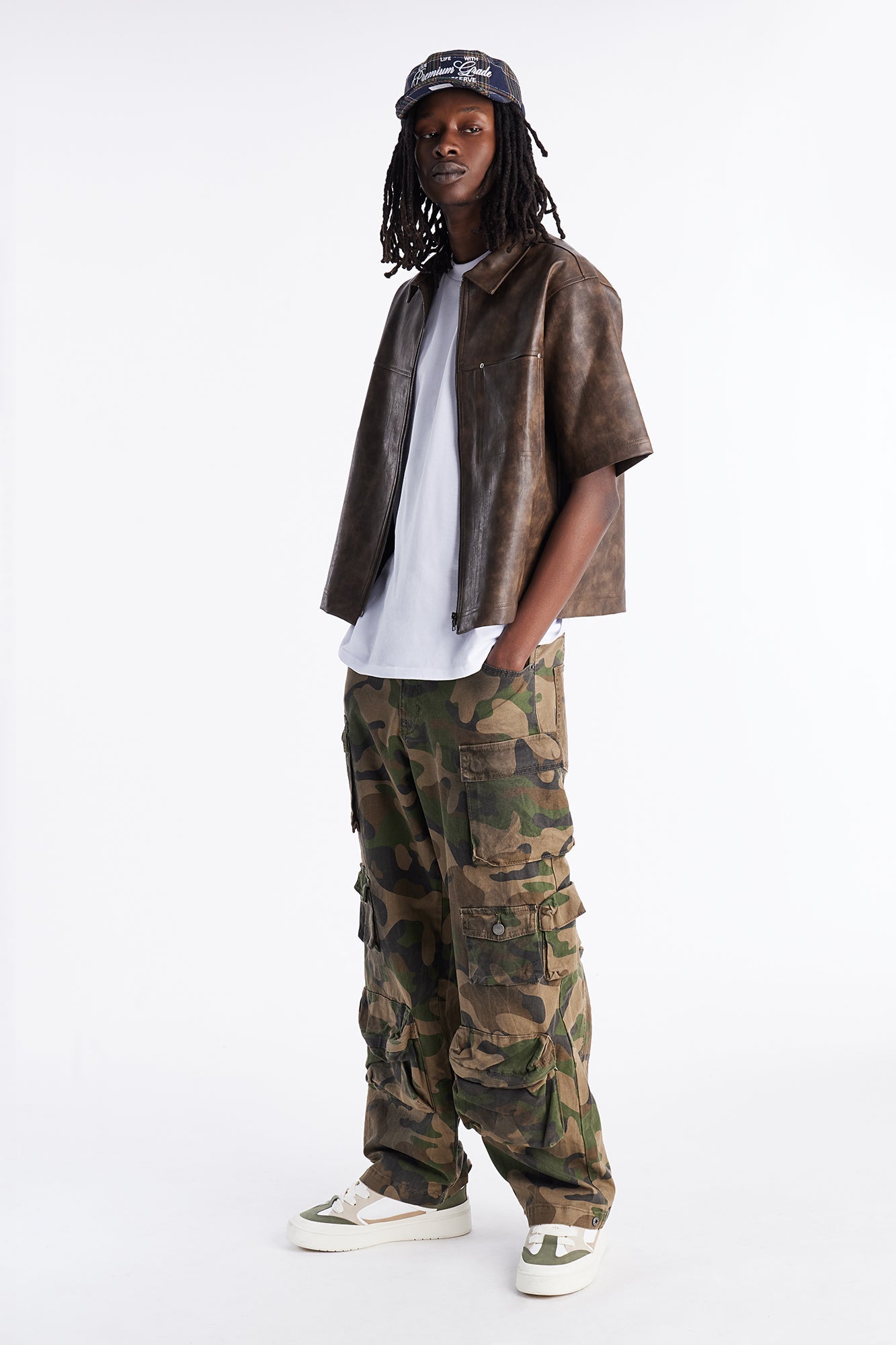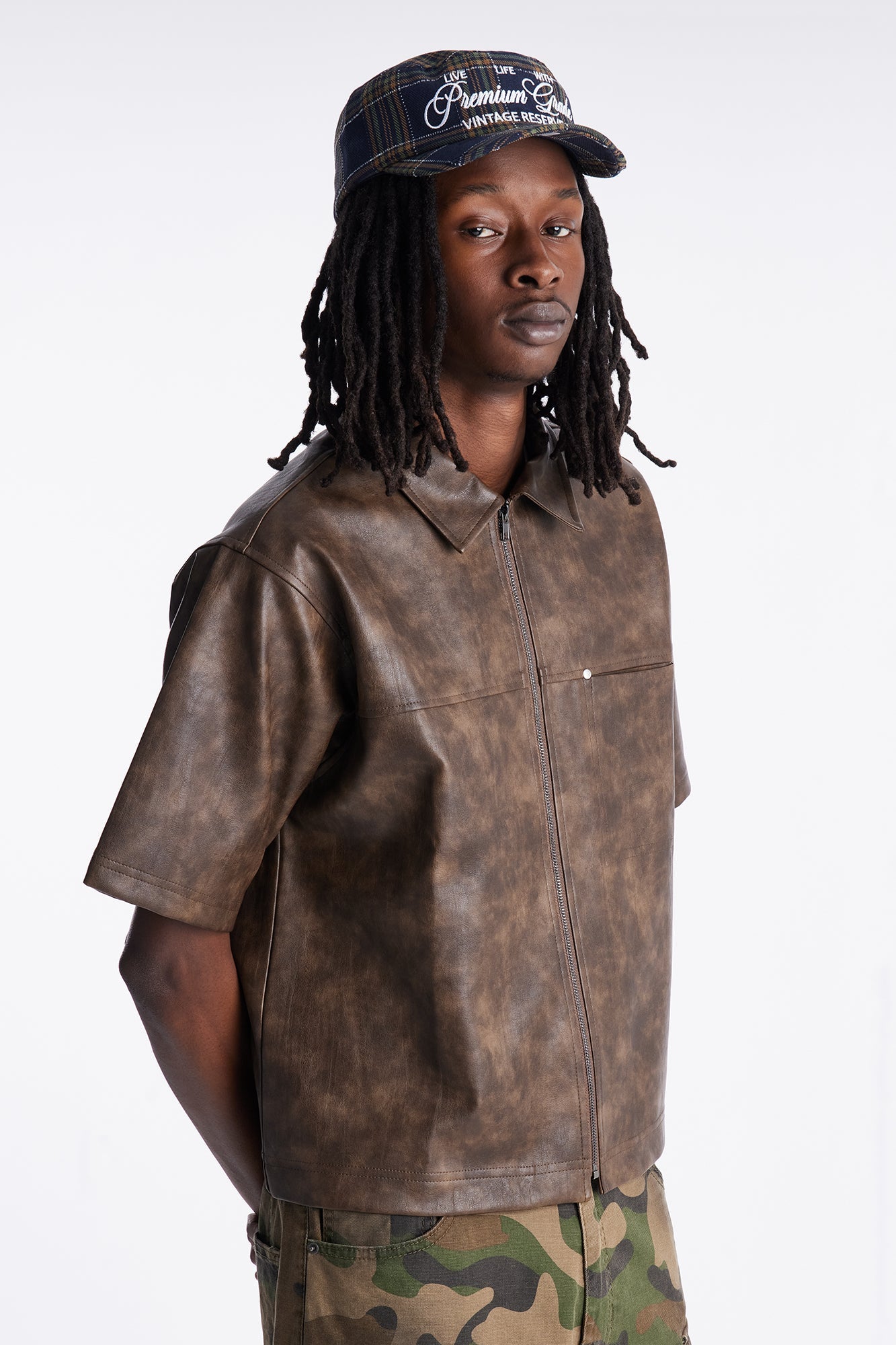 2 Stud Faux Leather Leather Zip Up Shirt - Brown